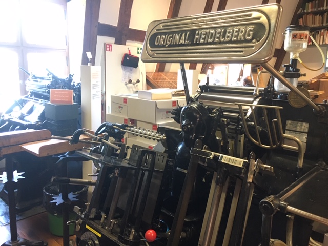Upstairs, there is a full letterpress print shop, including the original Heidelberg press shown here.