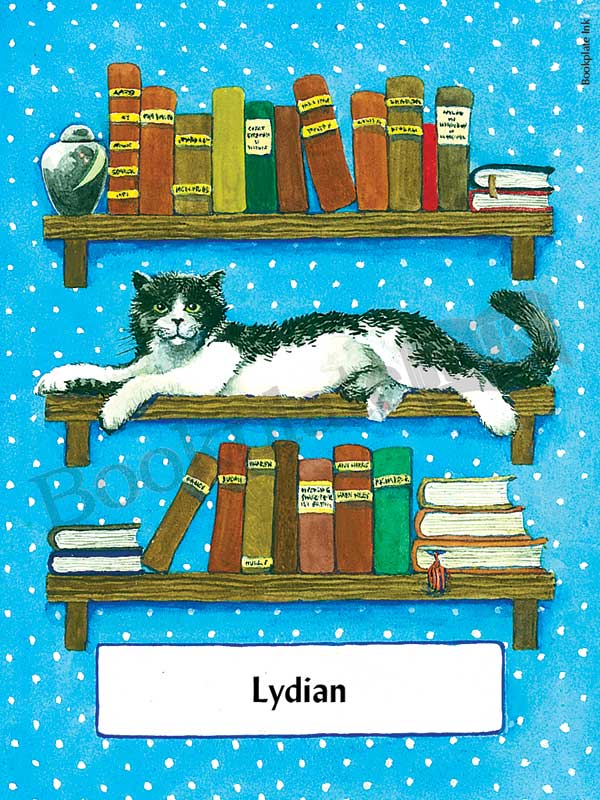 This bookplate, with a cat lounging on a bookshelf, was first offered by the Antioch Bookplate Company.