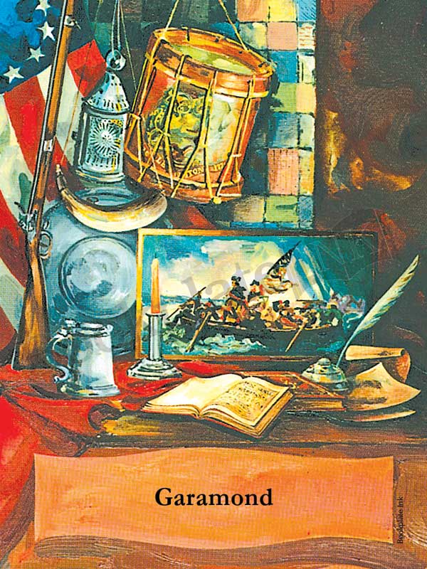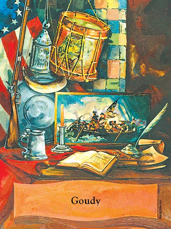This Americana still life painting shows a drum, quill, open book, flag and lantern. It was originally introduced by the Antioch Bookplate Company, in honor the the United States Bicentennial.