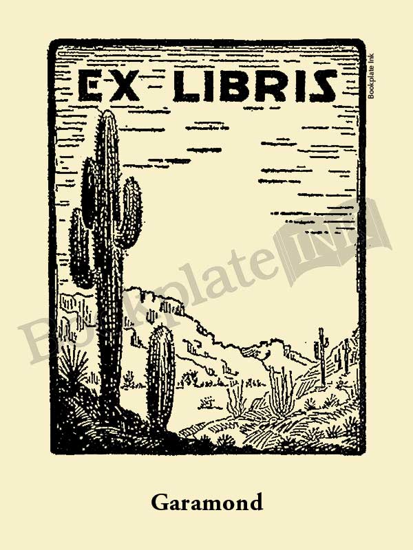 This southwest scene by artist Anton Helm shows a desert with a cactus in the foreground was first offered by the Antioch Bookplate Company in the 1940s. There is enough room in the name box for two lines of text.