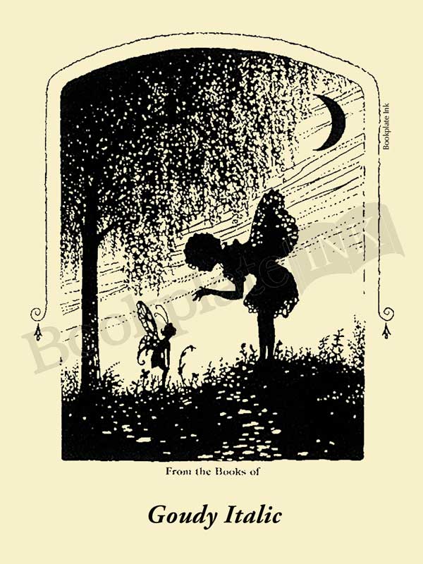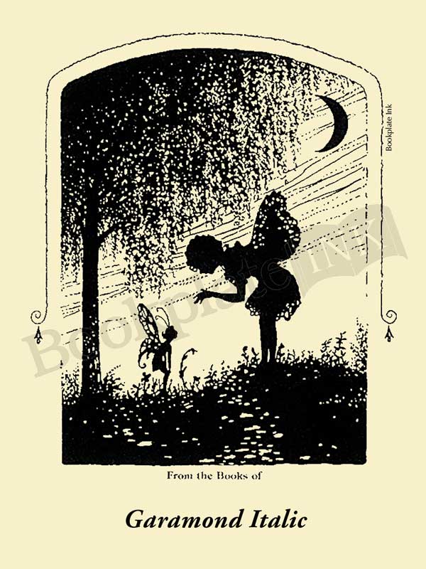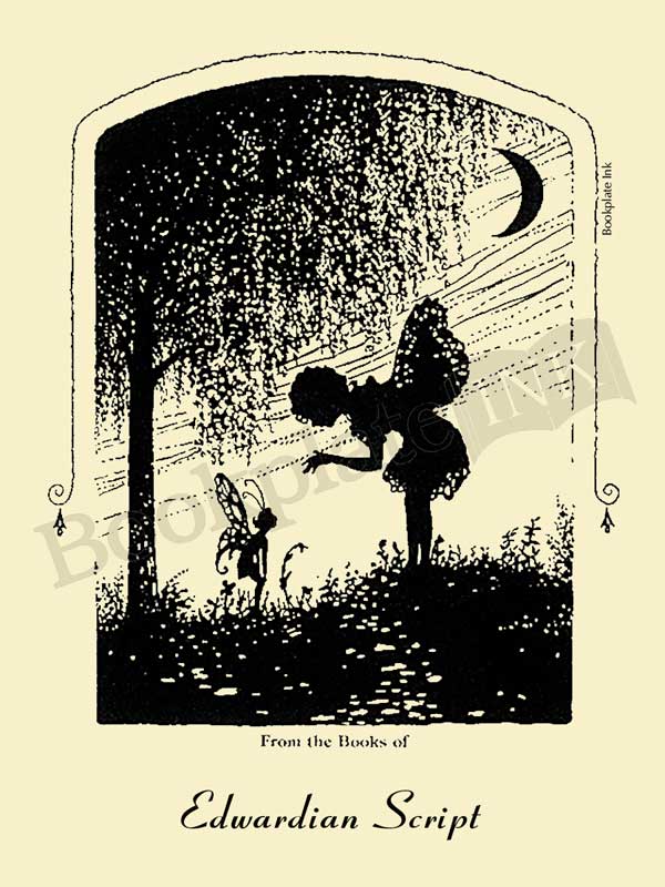 This charming bookplate of two fairies under a crescent moon is sure to appeal to the fanciful side of any book lover.