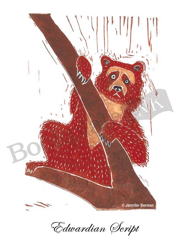 This artwork of a ucamari, or spectacled bear, is one of three bookplates featuring the artwork of Jennifer Berman, a nationally-known alternative cartoonist. These illustrations are part of a series of animal illustrations for her animal ABC book. Her work has appeared in newspapers and periodicals around the country and she has published four books, including the best-selling “Why Dogs Are Better Than Men” and “Why Dogs Are Better Than Kids.”