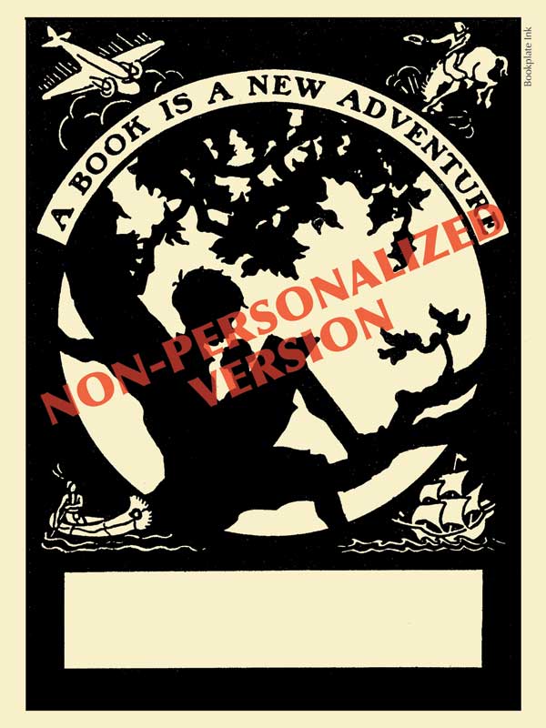This popular silhouette of a boy reading was introduced by the Antioch Bookplate Company in the early 1940s, but was discontinued in the 1970s. We are pleased to be offering it again. Artist Lebert Prether of Springfield, Ohio, was the designer and Antioch Bookplate Company founder Ernest Morgan wrote the wording “A book is a new adventure.” This version is available only with no text added. If you would like to have a name printed, please see our personalized version.