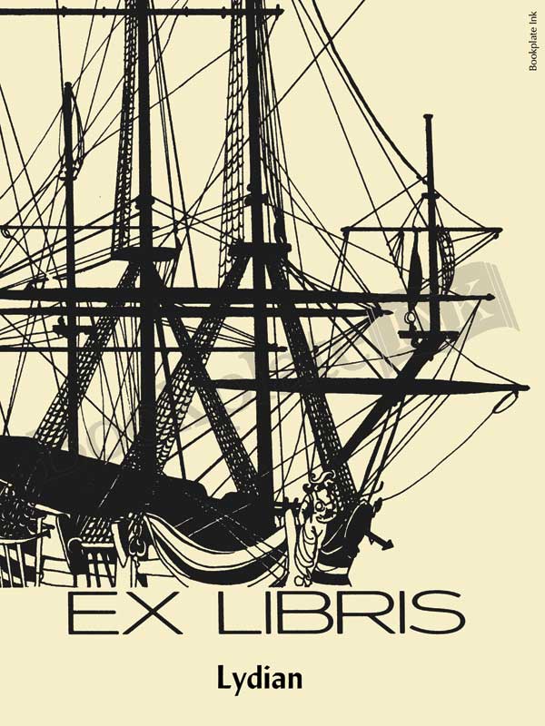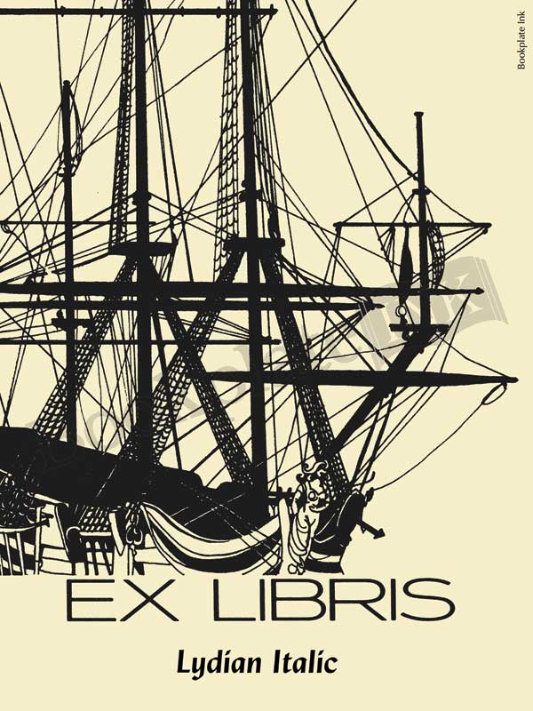 This bookplate, focusing on a majestic sailing vessel, is a design by Tom Till of the Antioch Bookplate Company. It was introduced in the 1970s. The “ex libris” text means “from the library of.”