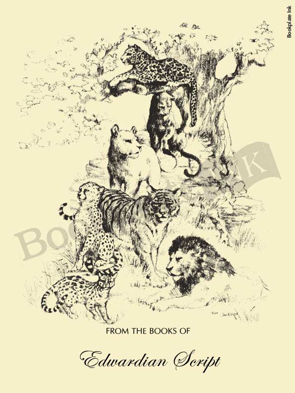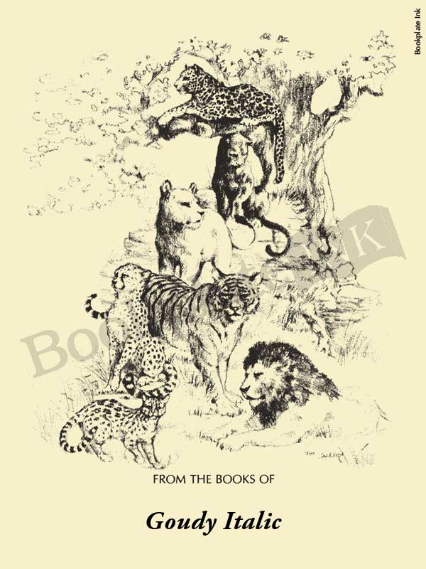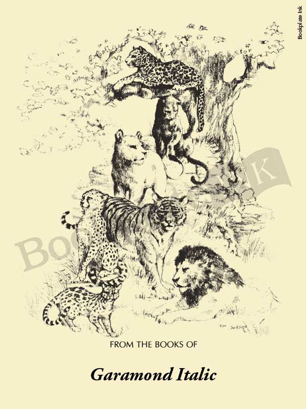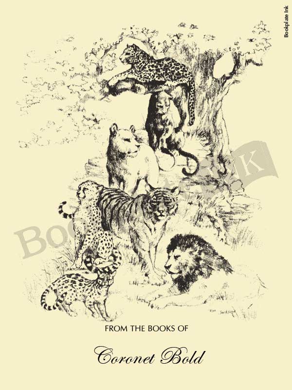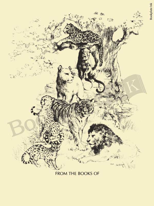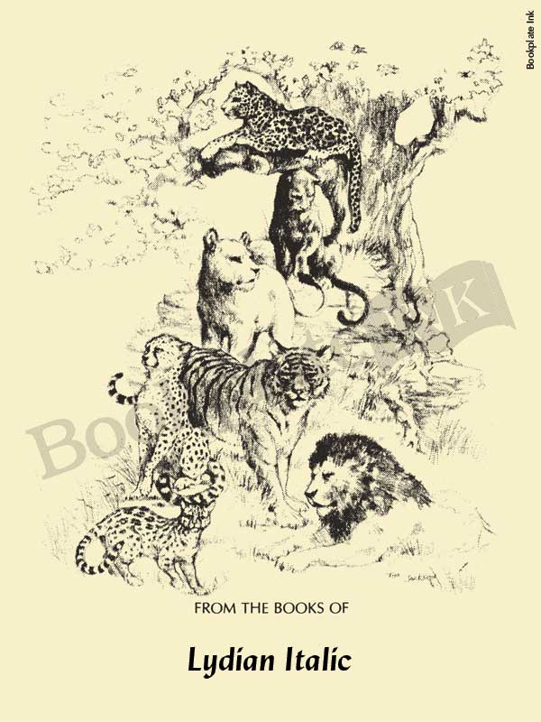 With its menagerie of wild cats — including a lion, tiger, and jaguar — this bookplate was introduced by the Antioch Bookplate Company in the 1970s.