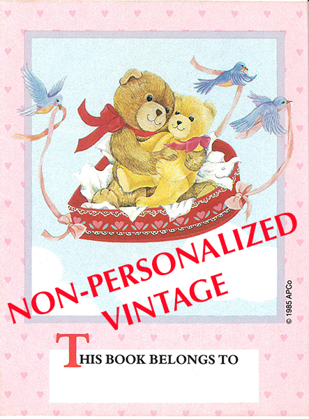 This sweet bookplate shows teddy bears hugging on a heart-shaped cushion, flying through the air while pulled by two blue birds. This is a vintage design printed by the Antioch Bookplate Company in the 1980s. We are now offering our limited stock of these vintage bookplates at special pricing. The bookplates are semi-glossy and self-adhesive, with a peel-off backing. These are in excellent and useable condition but are not new.