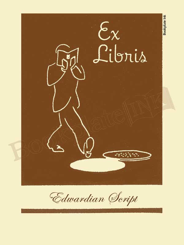 This design, showing an absent minded reader, is one of about a dozen created by Saturday Review illustrator Benton Ferguson. The series, called the “Young Moderns,” was introduced by the Antioch Bookplate Company in the 1950s. Out of print for years, Bookplate Ink has brought back three of the designs. The “ex libris” text at the top means “from the library of.”